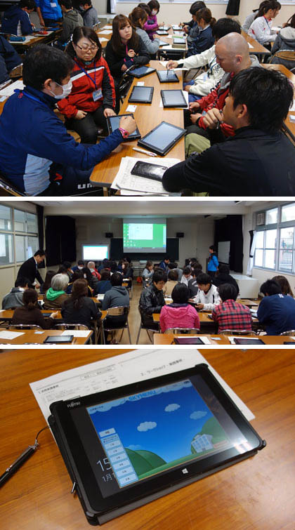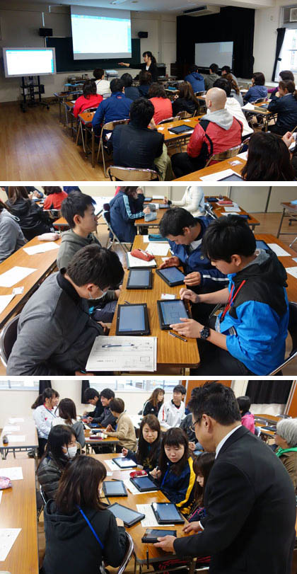 学習用ソフトウェアの操作方法、資料や教材の共有方法、電子黒板やスクリーンと連携させて発表に使う場合の基本操作など、タブレットを触りながら学んでいきました。