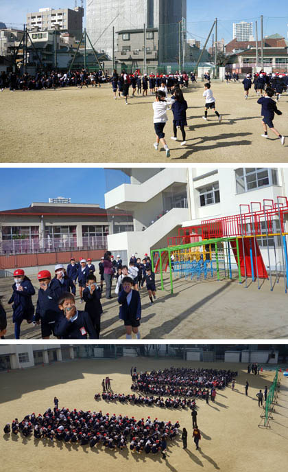 本校の1,4,5,6年生は運動場へ、分校の2,3年生は常盤公園へ避難します。分校組は、出入口と西側の階段は使わず(すぐとなりが給食室)、3年生は中庭から常盤公園へ避難、2年生は校舎東側の学習園〜スロープを通って校外へ出て、分校東側の道路を通って常盤公園へ避難しました。2年2,3組は、講堂で体育の学習中だったので、講堂からそのまま常盤公園へ向かいました。