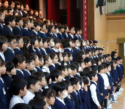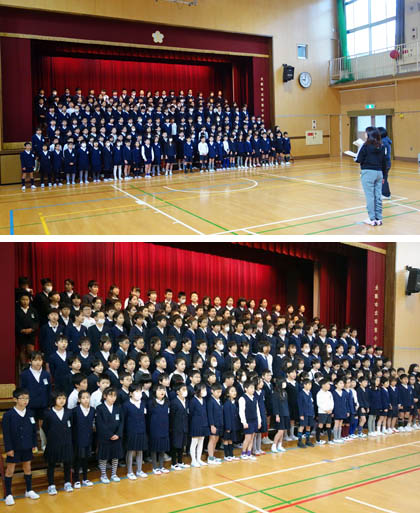 冷えた講堂を暖める、子どもたちの歌声。月曜1時間目は、声が出にくいかもしれませんが、本番も1時間目。朝一番からしっかり声が出せるように、まずは朝のあいさつから元気よくいきましょう。ちょうど今週は「あいさつ週間」です!