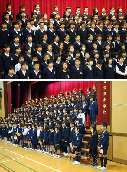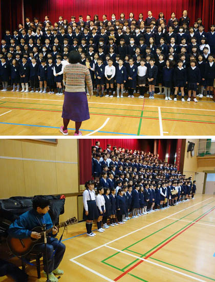 1時間目、講堂で二分の一成人式の歌やセリフの練習をしていました。