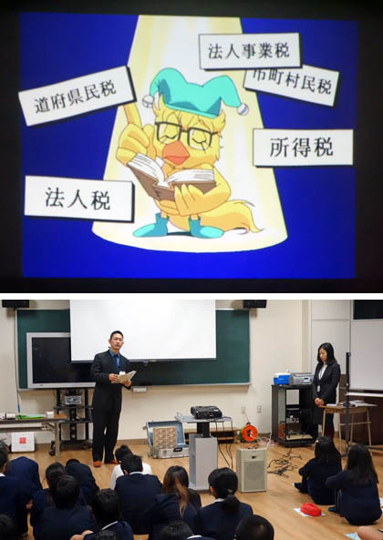 2,3時間目、多目的室で「租税教室」が行われました。あべの市税事務所から、3名の方が講師として来てくださいました。