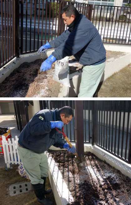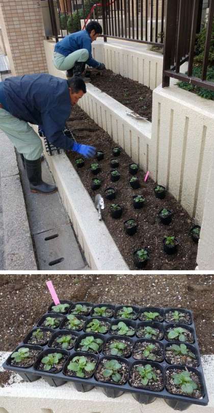 秋〜冬も“花づくりリレー”をしています! 管理作業員さんが、秋に届いていた花の苗の植え込み作業をしてくださいました。