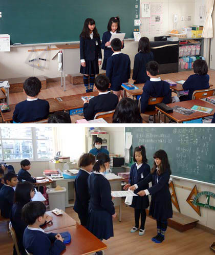 ホップタイム(朝の活動時間)に、各学級で、生活安全委員会の児童による「あいさつスター認定証授与式」が行われました。