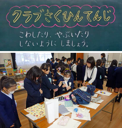21日(火)から3日間、クラブ作品の展示が行われました。作品を展示していたのは、手芸・まんが・読書・手作り工作の4つのクラブです。展示物の見学は、1年生から6年生まで、クラスごとに時間を決めてすることになっています。