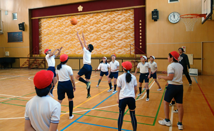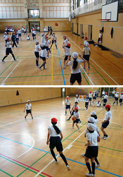 4時間目、講堂でバスケットボールをしているのは、6年1組の子どもたちです。