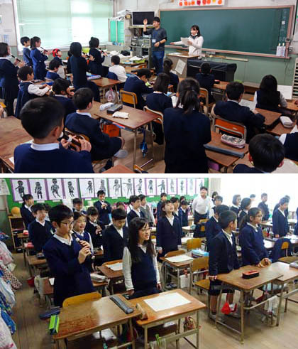 5時間目の3年5組。リコーダーの澄んだ音色が聞こえてきたので、教室をのぞいてみると、10日(金)の「卒業生とのお別れ会」での「ありがとうのことば」の練習をしていました。