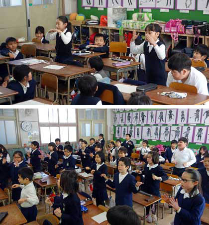 担任のS先生と、なかよし学級のKN先生の2人が、前に立って練習をリードします。セリフ・歌・ダンスと、なかなか盛りだくさんの内容。