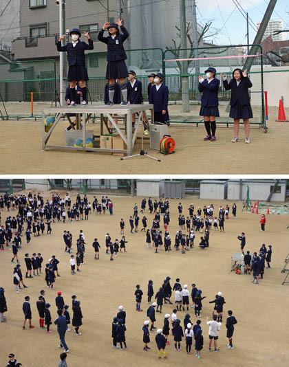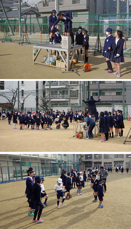 集会委員会が考えたのは「ジェスチャークイズ」です。2択クイズで、1番だと思う人はその場でかけ足、2番だと思う人はジャンプをするというルール。寒い季節なので、体を動かせるようにひと工夫です!