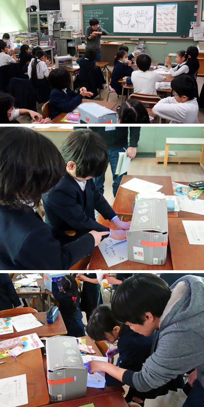 「手洗いチェッカー」なるツールが、班に1つずつ置かれていました。専用のローションを、手についた汚れに見立てて塗り、手洗いをした後、チェッカーの中に手を入れると、洗い残しの部分(=ローションが手に残っている)が光る仕組みになっています。