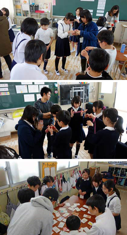 関西外語専門学校の留学生のみなさんとの交流会も、今回が最終回。留学生のみなさんに、昔ながらの日本の遊びを体験してもらいました。5年生の子どもたちが、留学生のみなさんをリードする活動です。