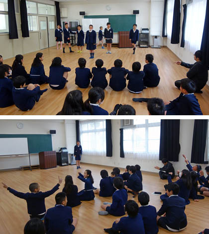 5時間目の多目的室。6年1組が、茶話会の出し物の練習をしていました。