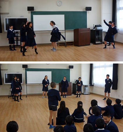 グループごとに何かをするようですね。出番以外の子は観客役で、盛り上がったり、手を挙げたり、問いかけに答えたり。茶話会の雰囲気づくりをしていました。
