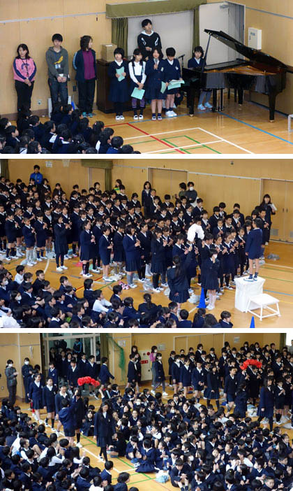 在校生が見守る中、花道を通って6年生が入場。入場曲は、5年生のリコーダー演奏による「カノン」です。