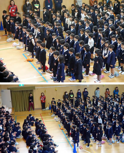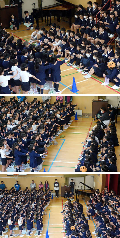 中学生なるお兄さんお姉さんを、精一杯励ました1年生。歌っているとき、期せずして手拍子が沸き起こり、講堂が温かな雰囲気になりました。