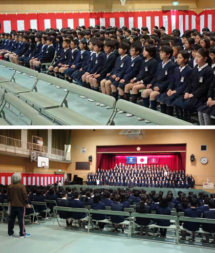 6時間目、卒業式の合同練習。「別れのことば」の練習に加えて、座礼・立礼・来賓紹介の際の会釈について、タイミングや長さの確認と練習をしました。