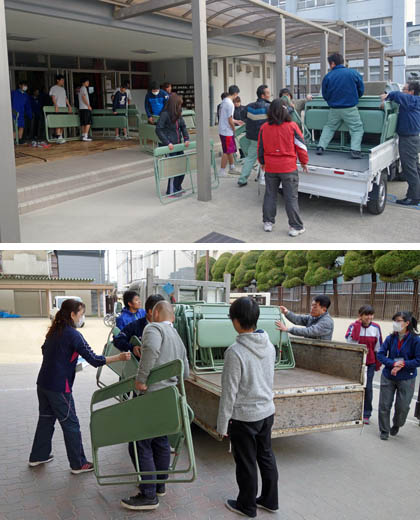 卒業式は、たくさんの長いすを必要とする行事(式典)です。卒業式だけは、常盤小にある長いすだけでは足りない(=保護者席数が少なくなる)状況でした。そこで、2年前の卒業式から、文の里中学校の長いすをお借りしています。今年も、80脚の長いすをお借りするということで、放課後、その運搬・搬入作業を行いました。