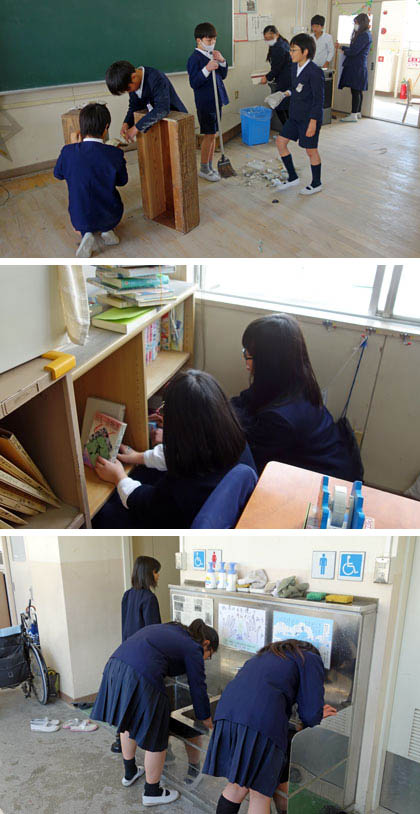 5時間目、教室・学習室・ろうか・くつ箱・トイレ・手洗い場を念入りに掃除しているのは、6年1組の子どもたちです。