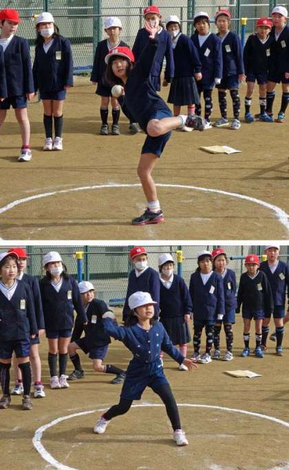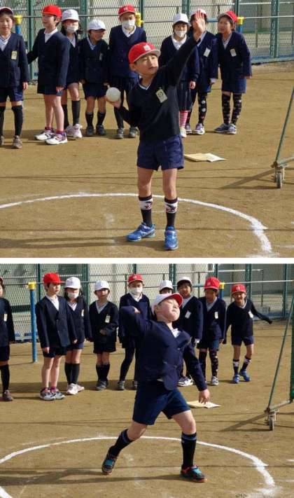 運動場の一角に、見たことのある扇形のラインが。ソフトボール投げのラインです。何年生? 2年生です! 1,2時間目に、新体力テストの種目であるソフトボール投げをしていました。