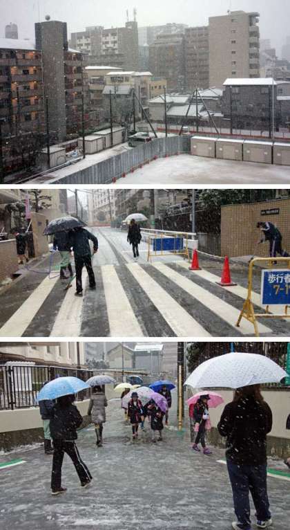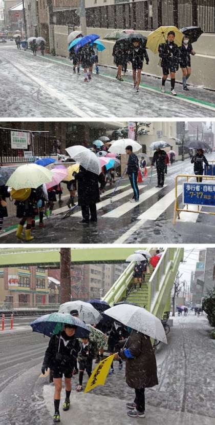 大阪は朝から大雪です。道路に雪&シャーベットがべったりと積もっていて、このままでは危険、7時半頃から管理作業員さんや教頭先生、他教職員が校門前で除雪作業をし、登校時間は安全サポートをしました。