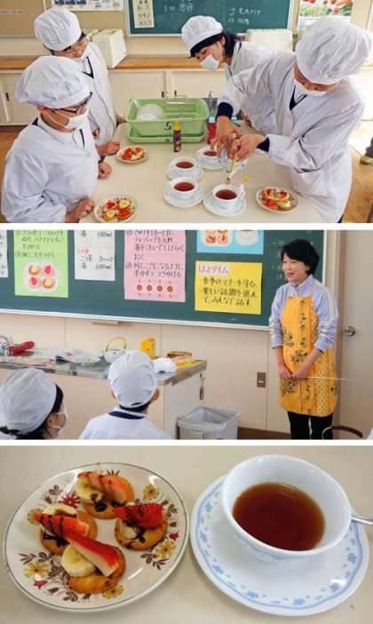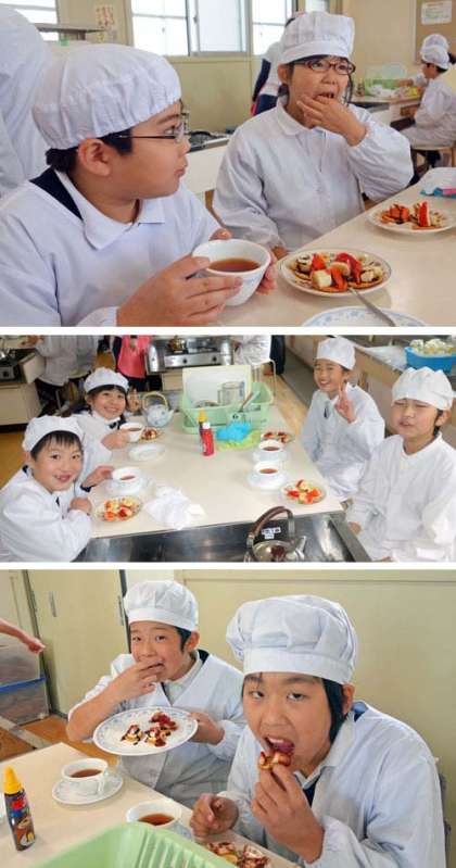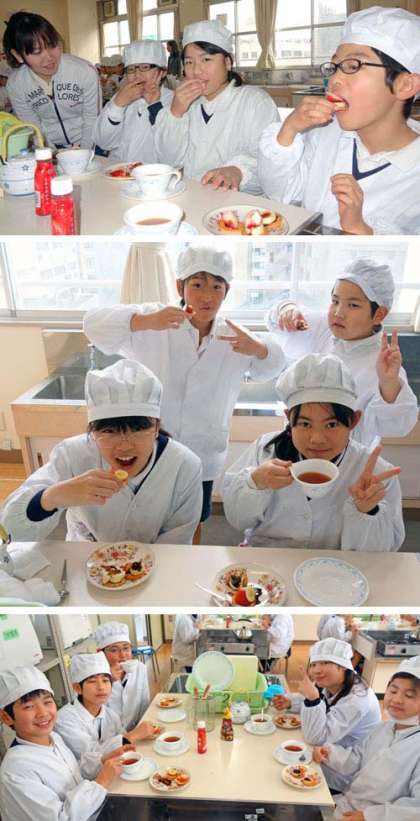 お待たせしました、5年生最後の調理実習は4組。もちろん「おやつと紅茶でほっとタイム」です。今回の実習には、4年生のH先生もスポット参加。H先生は、長年家庭科の研究をされていたのです。先生方のアドバイスを受けながら、てきぱきとスムーズに準備していく4組の子どもたち。