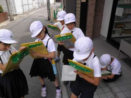 今日の2年生は、常盤の町へ町探検に行ってきました。各クラス5,6人の6つの班で計36か所を探検してきました。飲食店、コンビニ、銀行、消防署、保育所など様々なお店や施設に行きました。