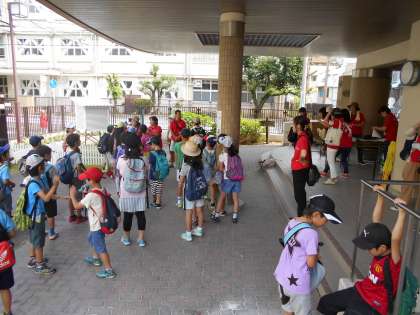 午前中は阿倍野消防署に移動し、区役所の方から防災・減災のお話を聞きます。災害発生時には、「自助」、「共助」、「公助」のそれぞれが大切などと教わっていました。午後には炊き出し訓練などを予定しています。