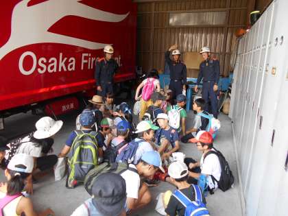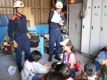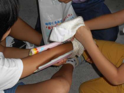 身近に有るものを使ってできる応急手当の方法を教わりました。使うのは、雑誌(パンフレット)、ネクタイ、スーパー等でもらうビニル袋です。今回は、腕を負傷したとの想定で、雑誌で腕を巻き、ネクタイで縛り、ビニル袋で腕をつるという手当でした。「こんな身近なもので応急手当できるなんて」と、子どもたちはびっくりしていました。