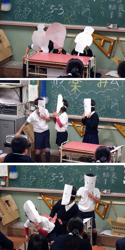 見に行ったとき、ちょうど3人の子がペープサート(紙人形劇)をしていました。しかし、話の途中いきなり仮面劇に発展! 自らCDデッキを操作、不思議な音楽が流れてきたかと思ったら、ゆる〜いエグザイルダンス! ツボにはまってしまいました!