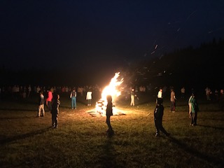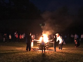 キャンプファイヤーの様子です。火の神から「挑戦の火」「 絆の火」「笑顔の火」「信頼の火」「協力の火」を授かり、火の精たちが点火をしました。