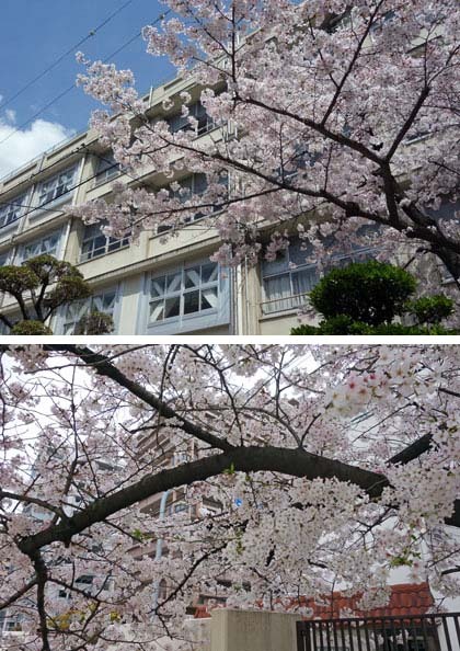 学校の桜が満開! 春らんまん、今が見ごろですね。一番上の写真は分校の桜、その下は本校運動場(南側)の桜です。