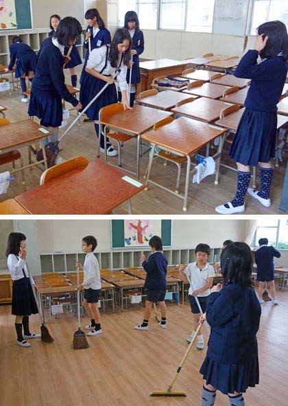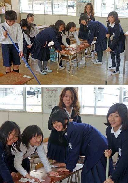 1年生が下校した後は、再び6年生の出番。掃除の時間に、1年生の教室・ろうか・くつ箱も掃除しています。もちろん、自分たちの掃除場所もありますから、同じ人数でいつもよりも広範囲を掃除していることになりますね。