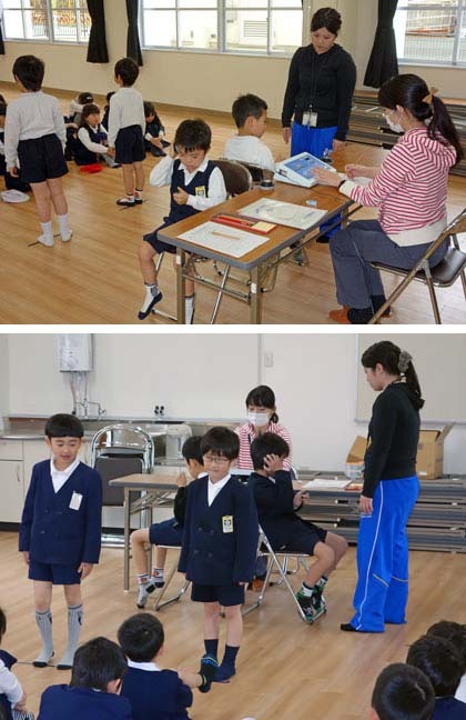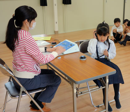 年度初めの4〜5月は、保健関係の検査や測定、検診が多くなっています。今週は、発育測定と聴力検査を実施中。今年は西校舎に多目的室ができたので、保健室と多目的室で同じ時間帯に2種類の検診が行えます。今日は保健室で3年生の発育測定、多目的室で2年生の聴力検査が行われました。