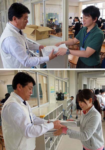 終わったテストは、その都度回収し、校長室で管理。すべて終わったら、まとめて箱に入れて封印。宅配便の方に持って行ってもらいます。