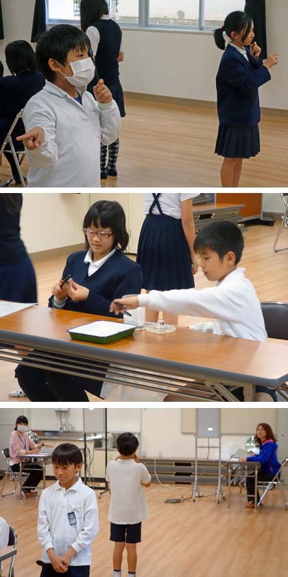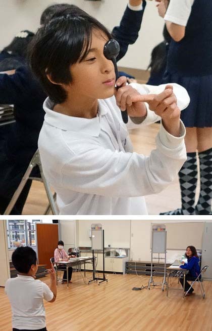 男女一人ずつが、遮眼子(しゃがんし=片目を隠すための黒いやつ)の消毒を担当します。次の子は後ろを向いて立ってスタンバイ、待っている子は横向きで座ります。Cマーク(ランドルト環(かん)というそうです)の開いている方向を覚えてしまったらダメですからね。