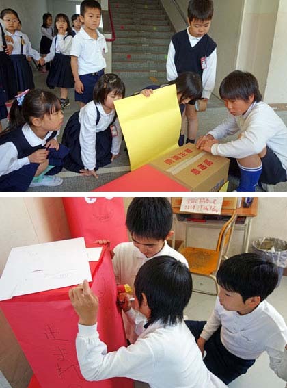 安全委員会製作の“ろうか・階段の安全通行をアピールする”置き物、「まもるくん」と「あるくくん」が、本日校舎内各所に設置されました。倒れないように、下の部分に“砂のおもし”を入れています。