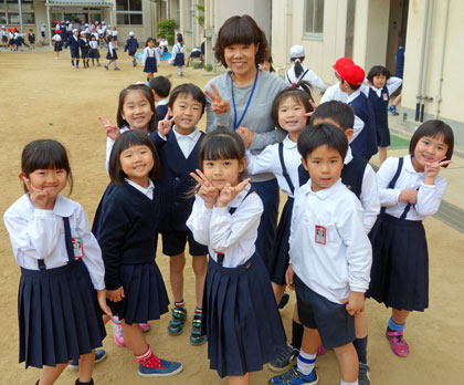 1年5組担任のK先生と子どもたちです。15分休みにケイドロをしていたそうですよ。