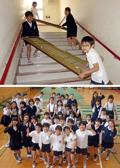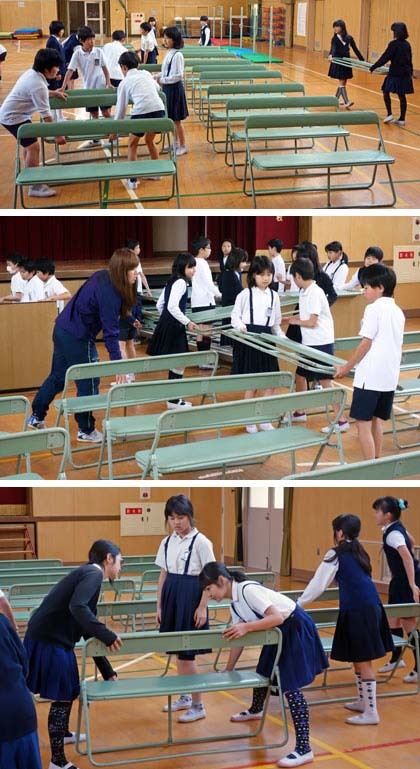 4時間目、講堂に集まった5年2組の子どもたち。PTA予算総会の会場づくりをするためです。長いすの並べ方が少し複雑だったのですが、協力して30分で仕上げてくれました。