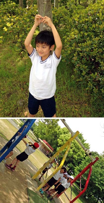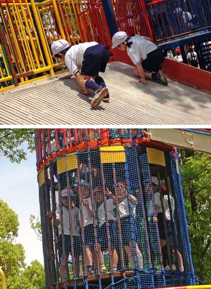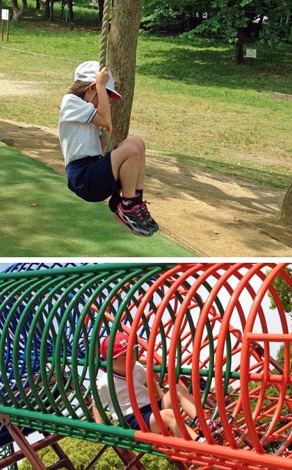 わんぱくランドですね。すべり台にリングのトンネル、ターザンロープ。元気いっぱい遊んでいます。緑もいっぱいで、昆虫探しをしている子もきっといるでしょうね。