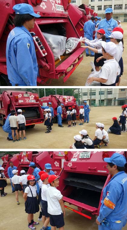 3時間目、運動場に出ると、パッカー車3台が4年生を待っていました。新聞紙を詰めたごみ袋をごみに見立てて、3〜4人ずつ同時に投入口に放り込みました。投入口の横にあるボタンを押すと、ごみが中に押し込まれていきます。