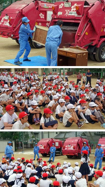 最後に質問タイム。「大阪市でごみ処理の仕事をしているのは何人ですか?」「大阪市にあるパッカー車は全部で何台ですか?」「ごみ収集車のことをなぜパッカー車というのですか?」などなど、時間いっぱいまで質問をぶつけていました。ちなみに「パッカー車にはどれぐらいのごみが積み込めるの?」の答えですが、一度に積み込めるのは、平均的な量の家庭ごみ500家庭分だそうです。車内ですさまじく圧縮されているんですね。どんな状態になっているのでしょうか。