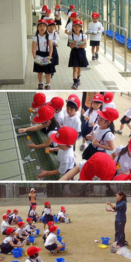 2時間目、西校舎前でアサガオの種まきをしました。最初に、植木鉢に半分くらい土を入れ、水をまいて土をなじませました。その後、残りの土を入れました。