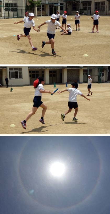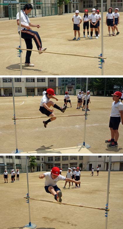 3時間目、運動場では、1組がリレー、6組が走り高跳びの学習をしていました。リレーはチームの記録短縮、走り高跳びは個人記録を目指して…。