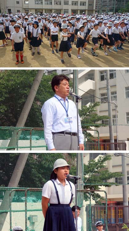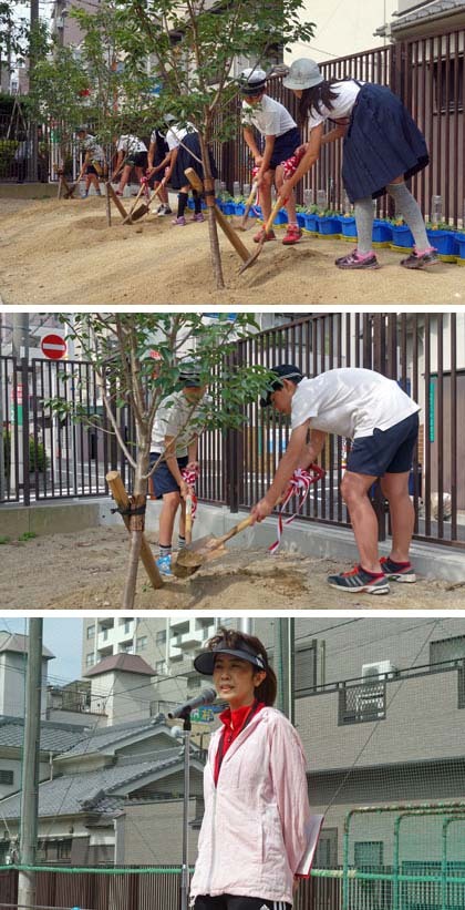 昨年9月、新校舎建設工事にともなって伐採されたサクラに代わって、若いサクラを3本、大阪市教育委員会からいただきました。その植樹式を、児童朝会の中で行いました。