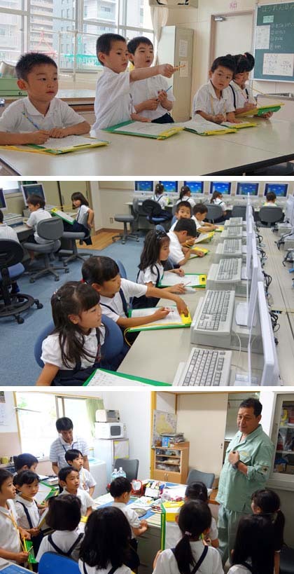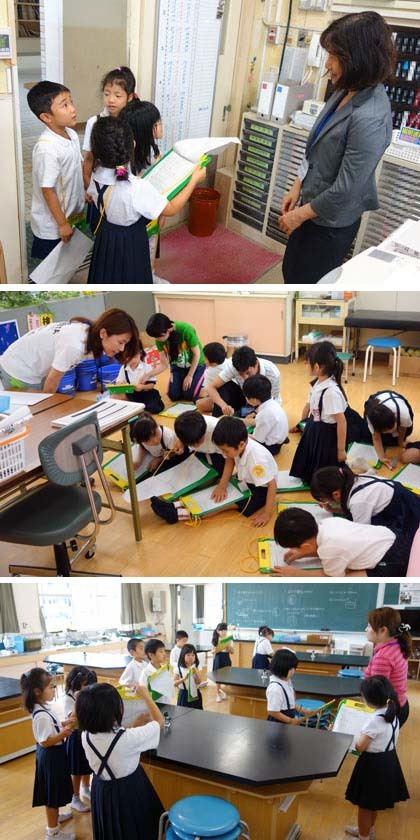 3〜4人で一つのグループを作り、グループごとで2カ所ずつのたんけんです。たんけんボードを片手に校内をうろうろ。職員室や管理作業員室、事務室や保健室では、教職員に質問して、分かったことをメモしていました。教室の様子や、見つけたものの絵も描いていました。座り込んで一生懸命描いている子も。