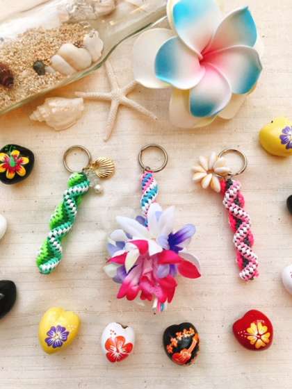 ※キーホルダーのパーツ、ハワイアンコードは申し込み手続き当日に見本を見ながら選んでいただきます。(作品もご覧頂けます)