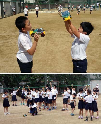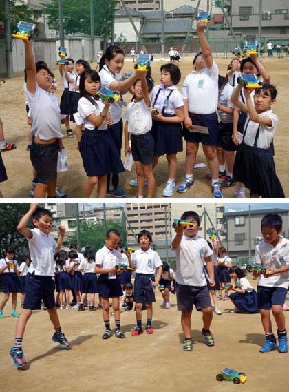1時間目の終わりごろ、4年5組の子どもたちが車を片手に運動場に出てきました。車は、光電池搭載のソーラーカー。もちろん自分で組み立てたものです。光電池に太陽の光を当てて電気エネルギーを発生させ、ソーラーカーを走らせようというわけです。