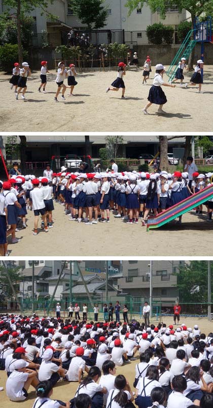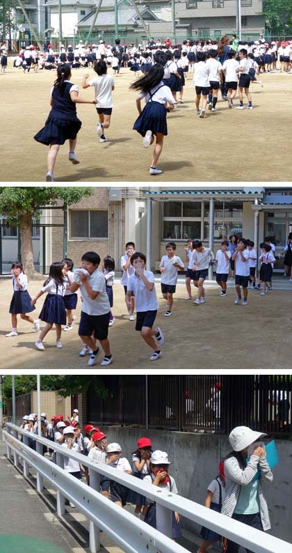 本校の1・4・5・6年生は運動場へ、分校の2・3年生は常盤公園へ避難します。分校は、出入口は通らず(すぐとなりが給食室)、2年生は中庭から常盤公園へ避難、3年生は校舎東側の学習園〜スロープを通って校外へ出て、分校東側の道路を通って常盤公園へ避難しました。本校児童の避難完了にかかった時間は4分44秒、分校児童は5分42秒でした。