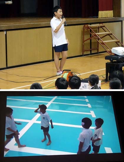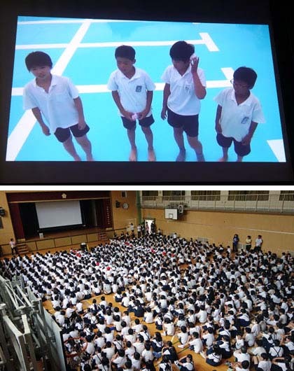 来週から始まる水泳学習に先立って、講堂で映像が上映されました。運動委員会が制作したものです。その内容は、水泳学習で気をつけることを、劇仕立てでみんなに伝えるというものでした。たとえば…