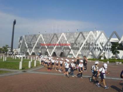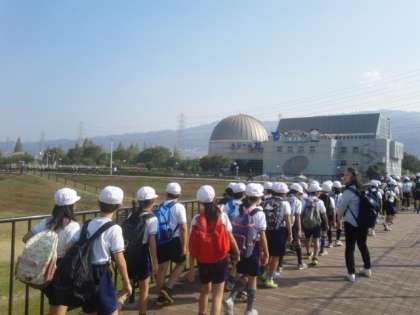 4年生の遠足です。花園ラグビー場の横を通り、花園中央公園に着きました。まずは、公園内のドリーム21の施設でプラネタリウムを見ます。