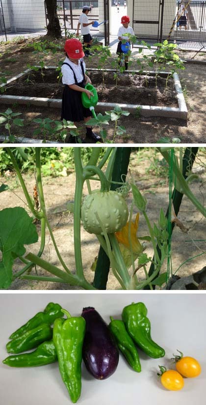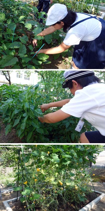 8時15分、西門前に集合し、先生といっしょに飛び地の学習園へ。ジョウロ片手に水やりをしながら、実の出来具合をチェックし収穫します。収穫したものは、栽培委員で分けて持って帰ることもあります。